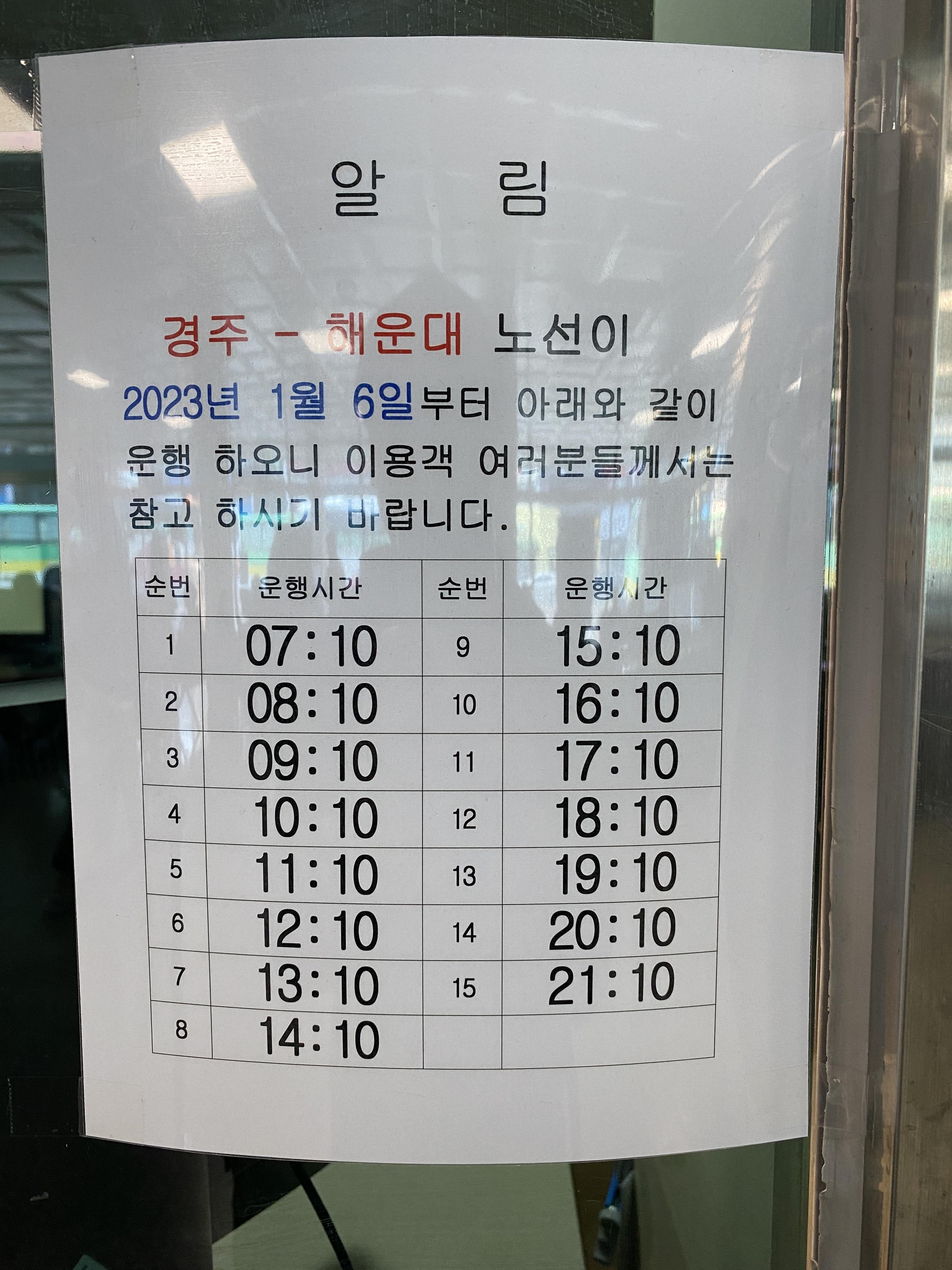 그래도 최근 코로나가 풀리면서 여러 노선이 복귀하는 것 같다. 경주시외버스터미널에서 해운대로 가는 버스는 첫차 7시 10분, 막차 오후 9시 10분으로 매시 10분에 운행한다. 경주에서 해운대는 약 1시간 20분 정도 걸리고, 어른 우등 기준으로 10000원이다.