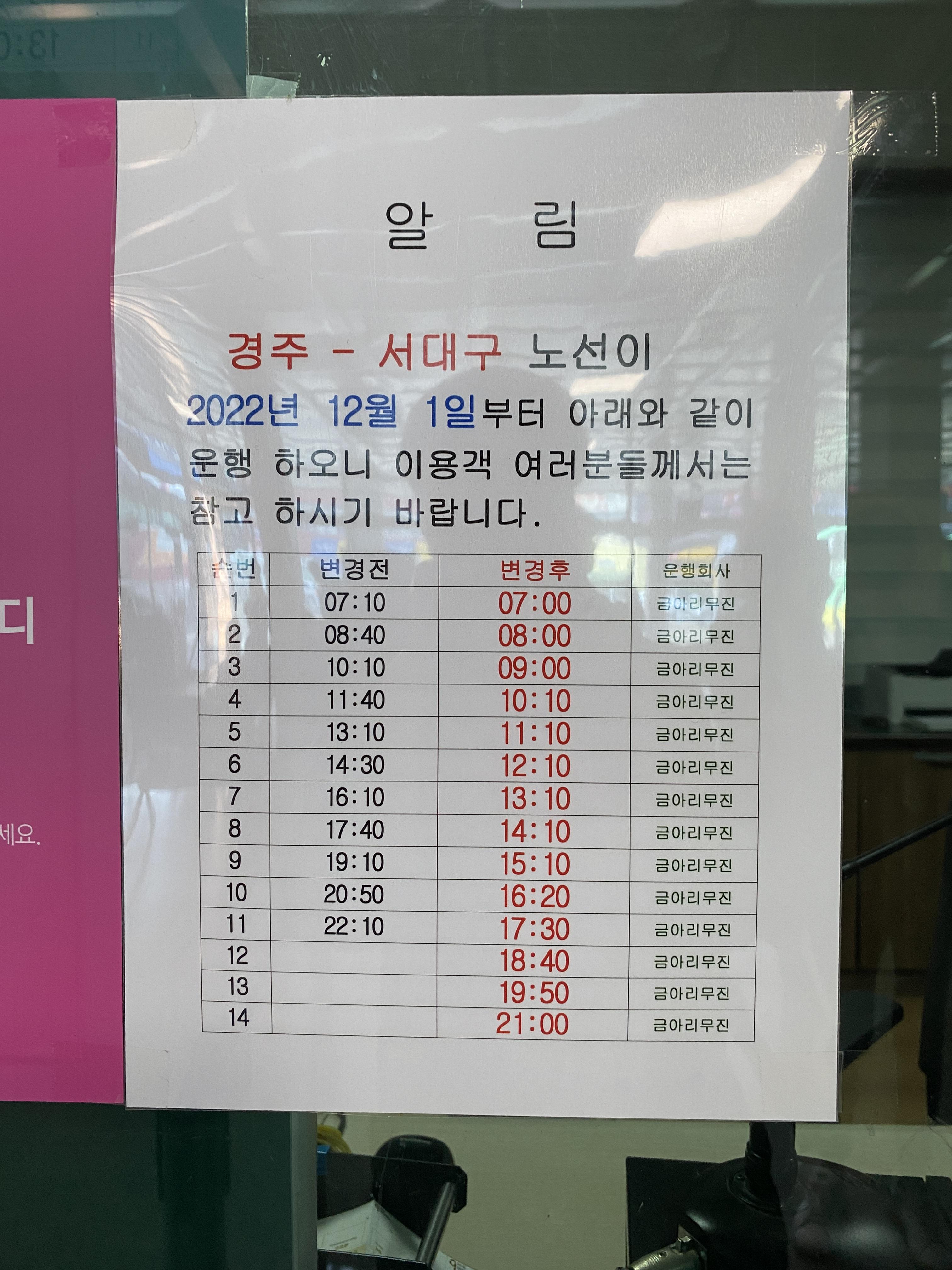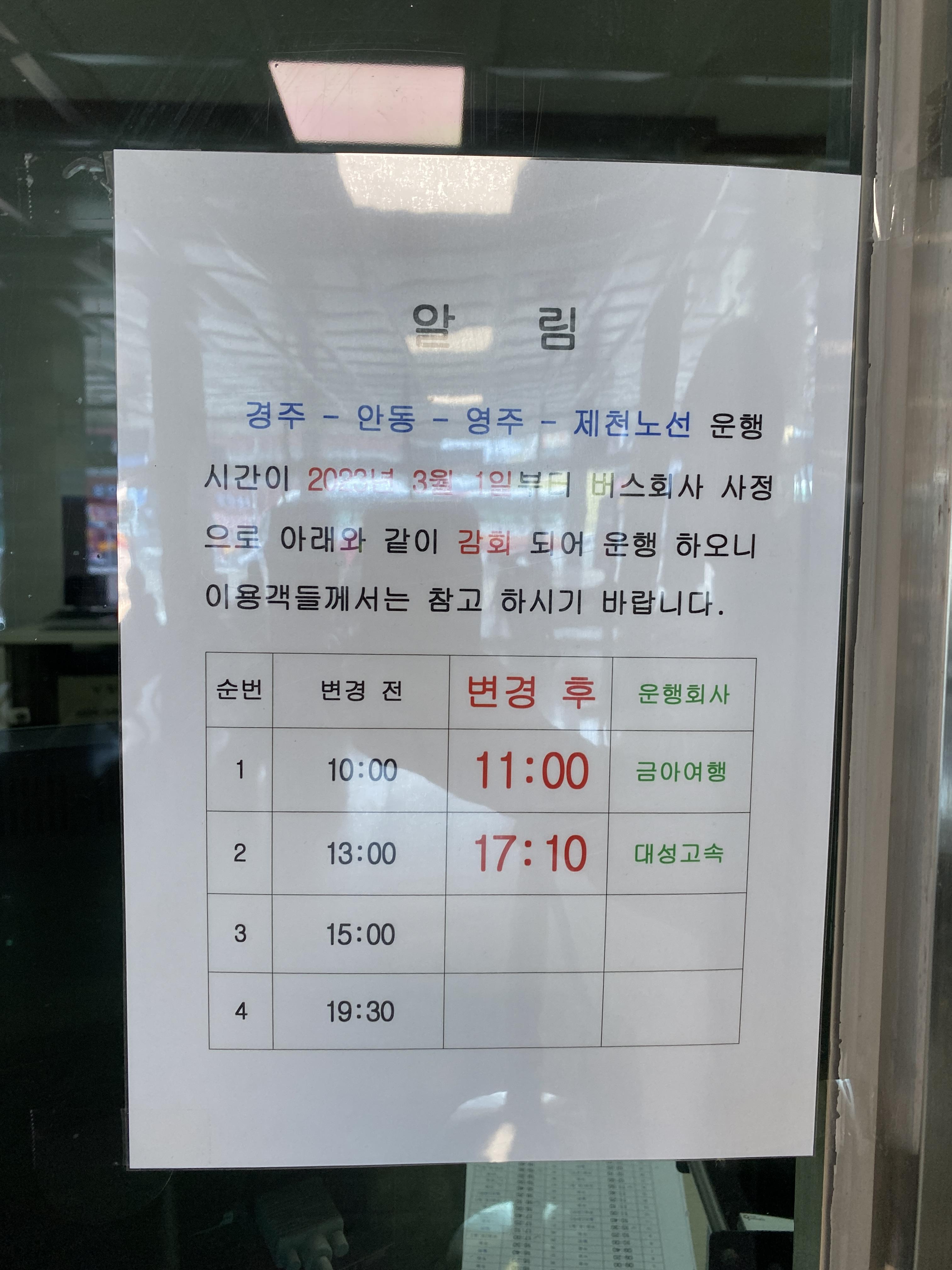 반면 경주-안동-영주-제천으로 가는 버스는 3월 1일부터 감회한다. 11시와 오후 5시 10분으로 하루에 2번 운행한다. 코로나가 버스 감회의 전부는 아니다.