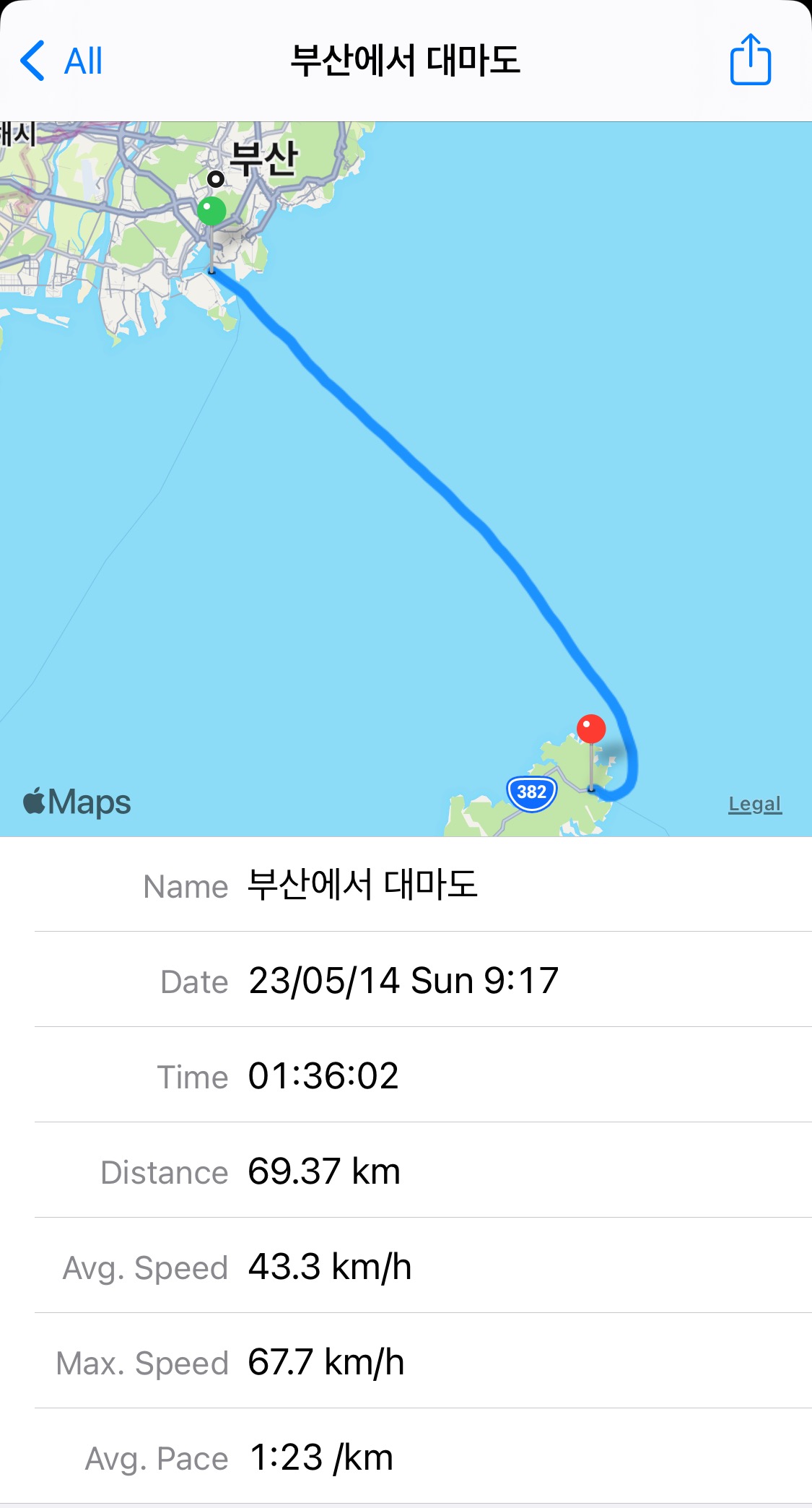 그리고 정신을 차려보면 대마도에 도착한다. GPS로 확인해보니 1시간 30분 보다는 조금 더 걸린다. 부산항대교부터 측정했으니 1시간 45분 걸린다고 생각하면 된다. 항로로만 따지만 70km 정도 걸린다. 시속 45km 정도로 가는 샘이다.