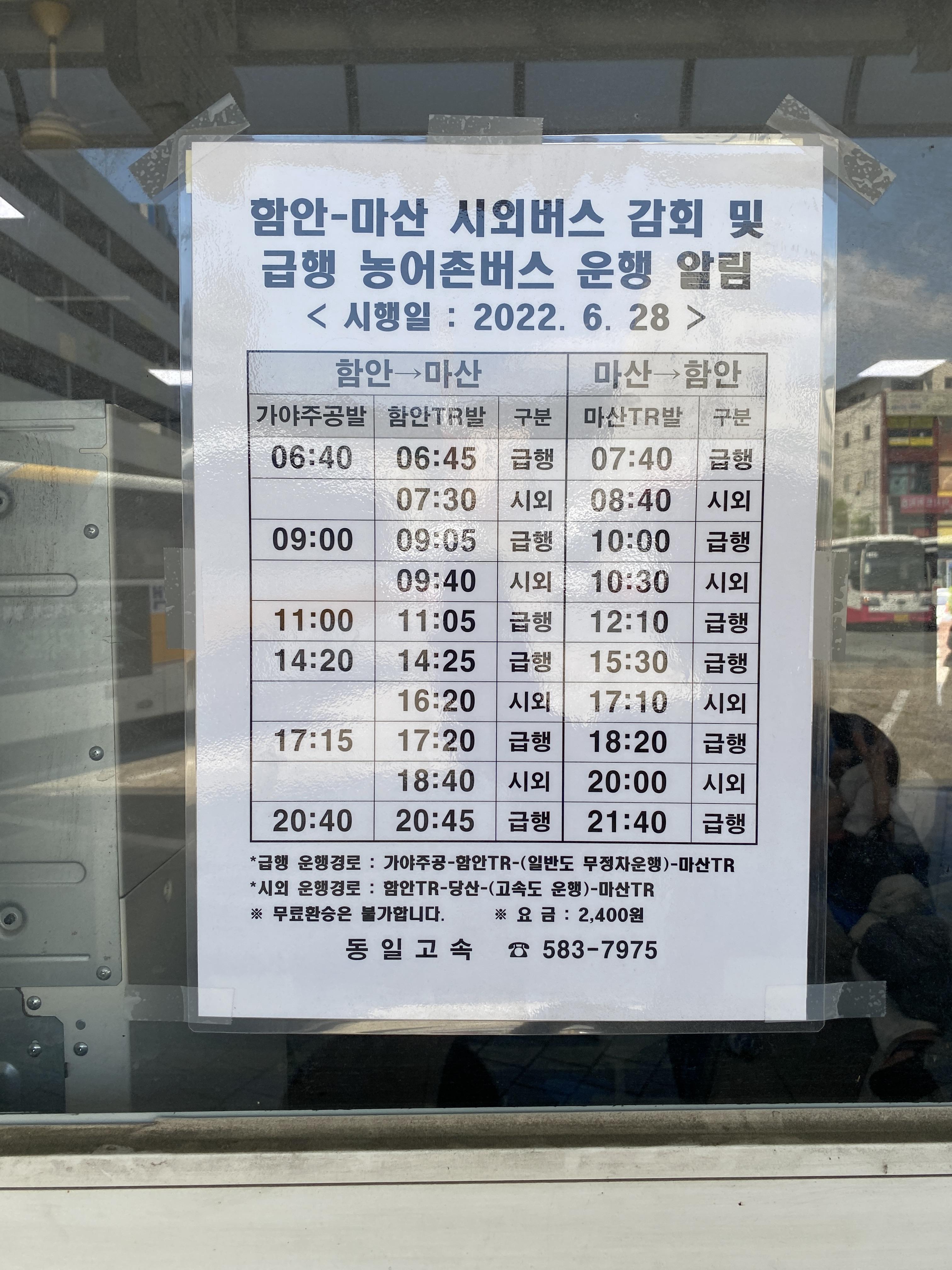 단, 의령으로 가는 버스는 08:10에도 있는데 함안, 군북을 경유해서 간다(8번 승차홈). 가격은 5300원으로 더 비싸다.