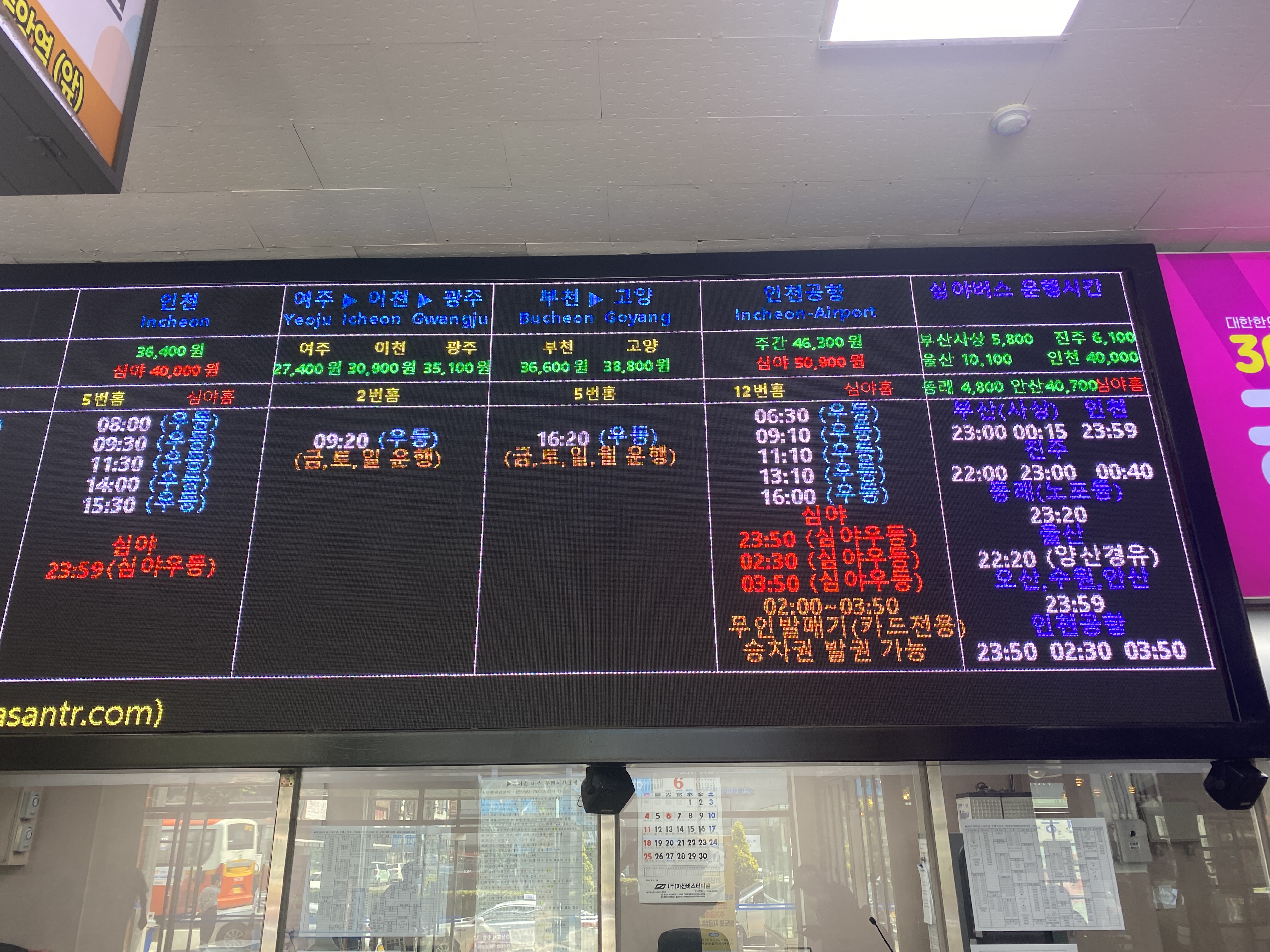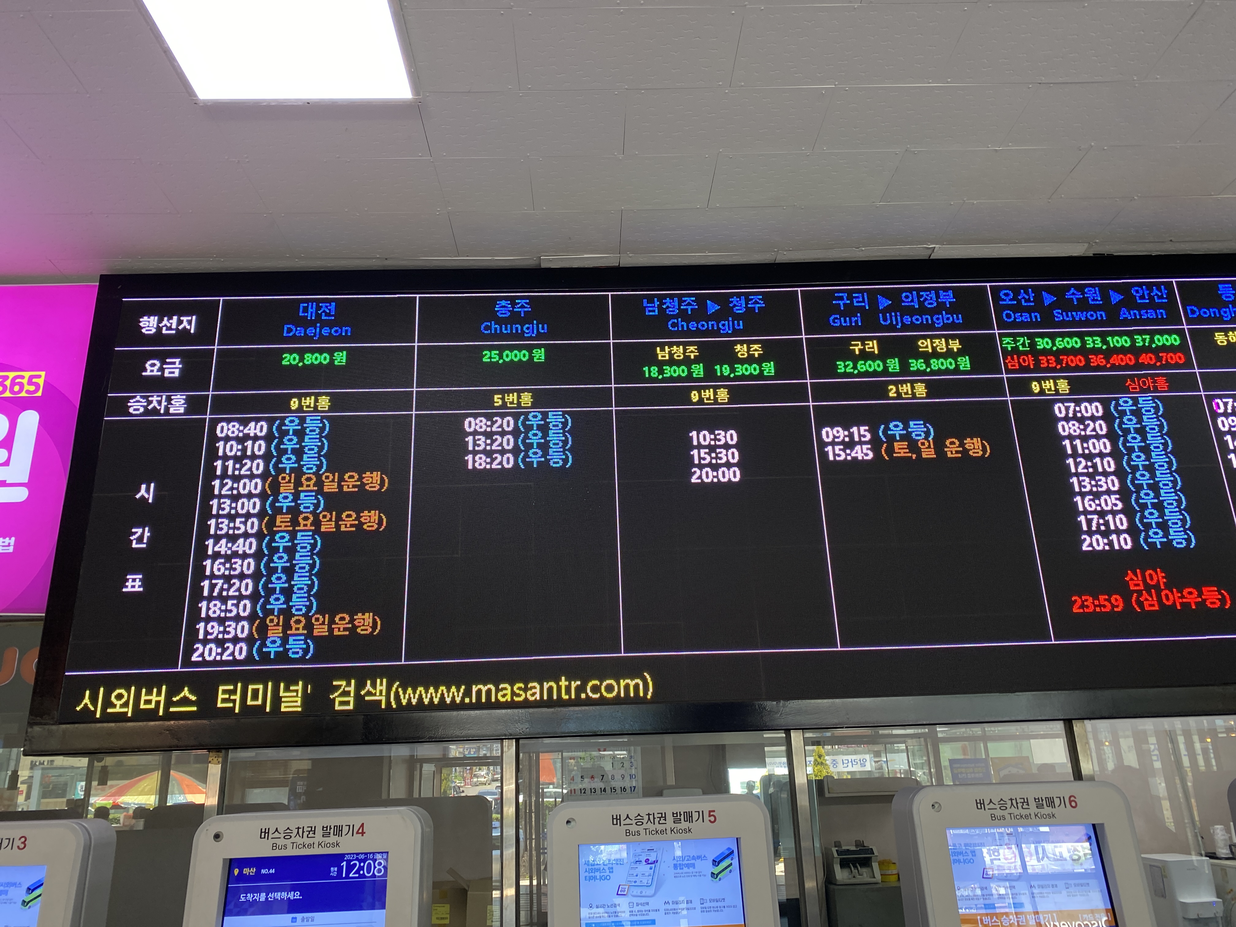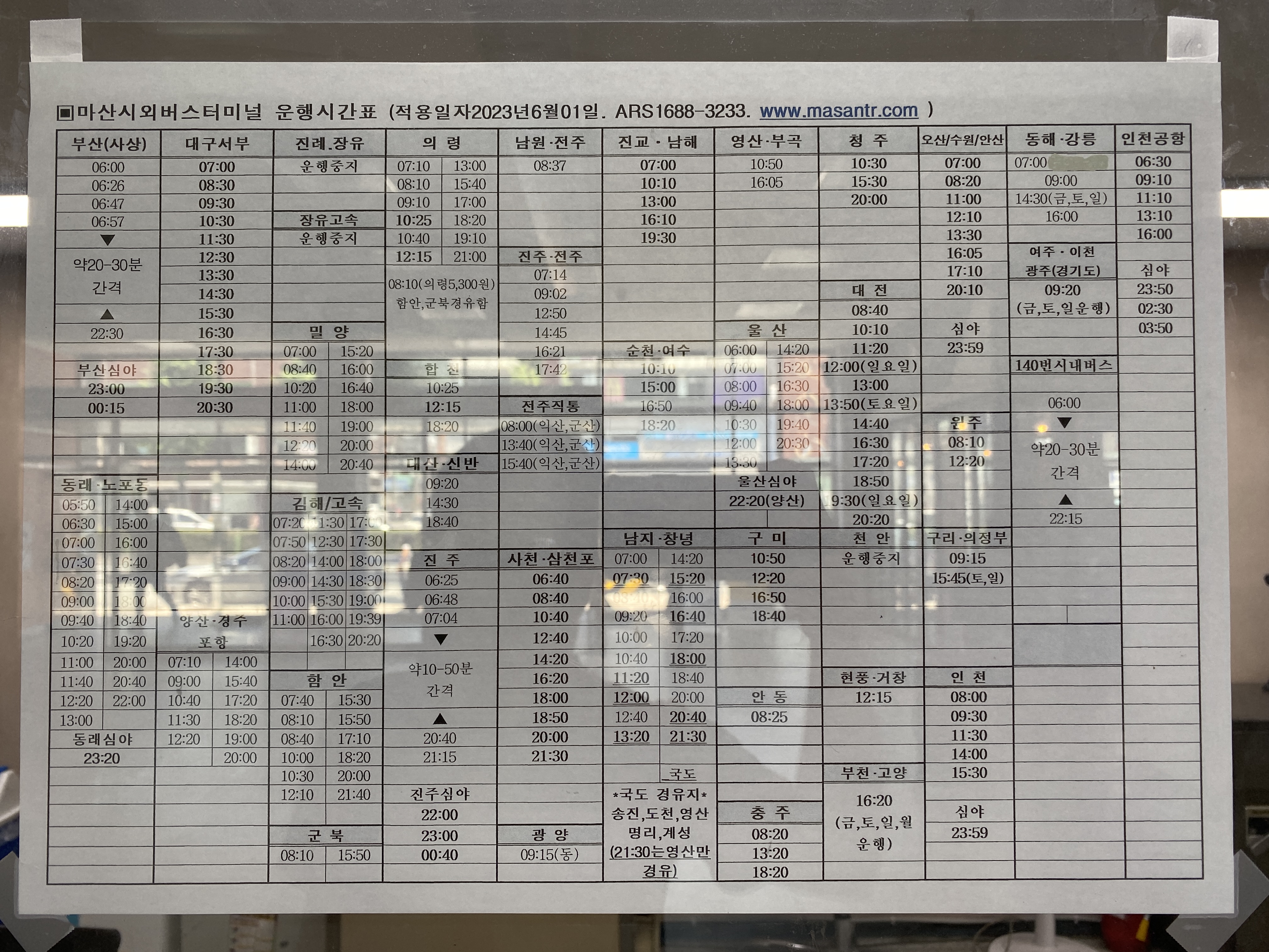 마산시외버스터미널 시간표. 역시 부산가는 버스가 가장 많다.