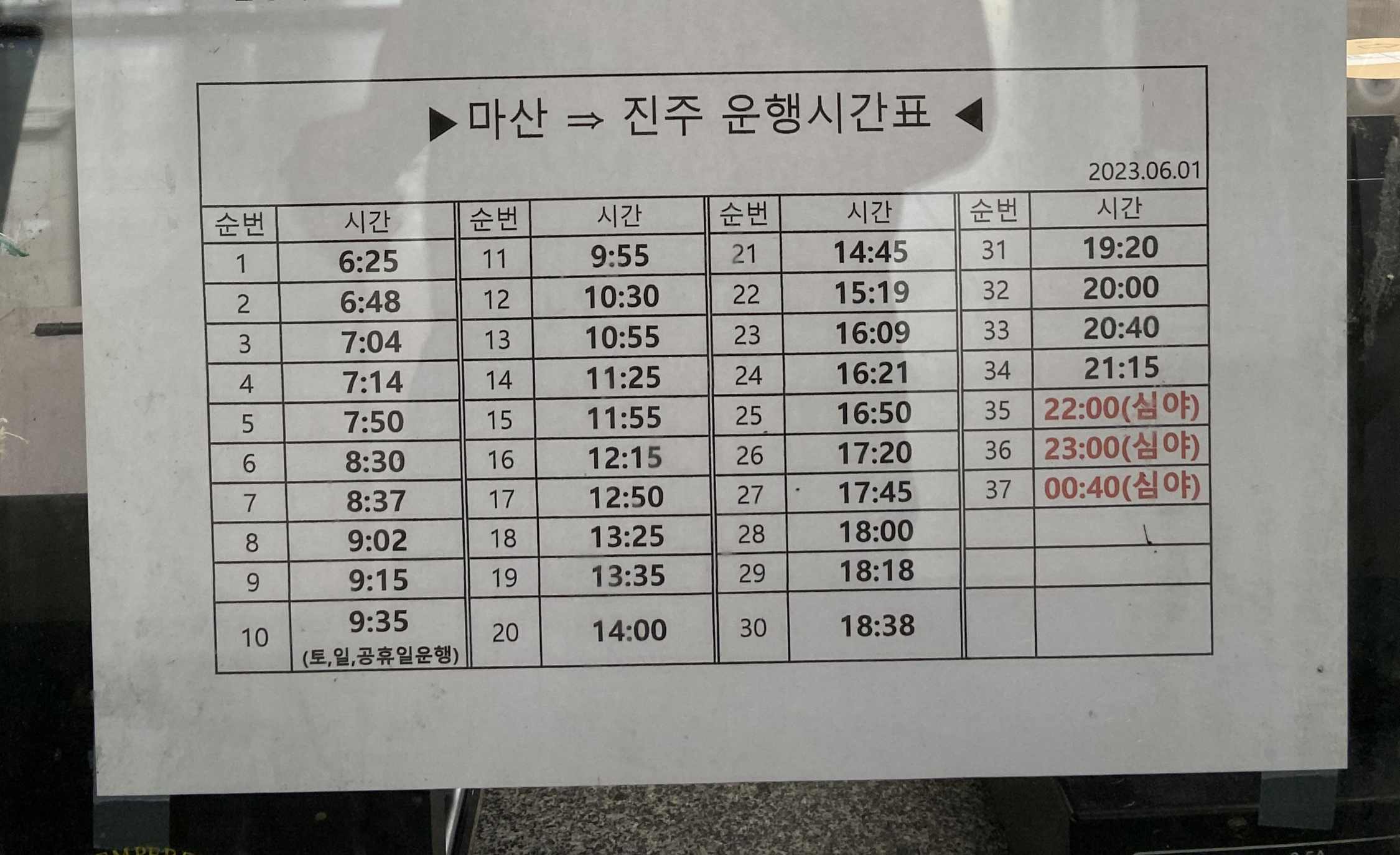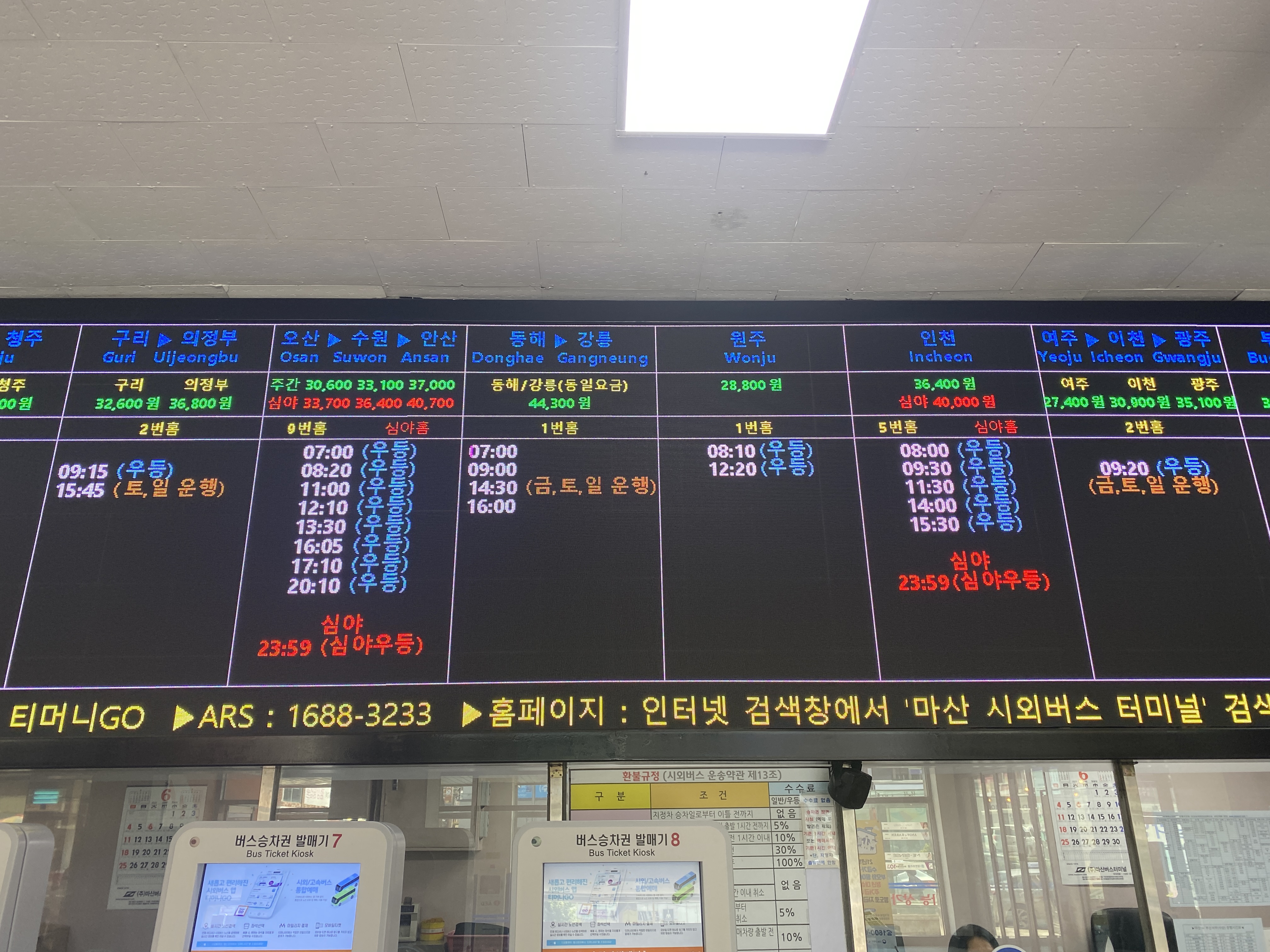 행선지가 많지만, 한 눈에 알아볼 수 있는 마산시외버스터미널 운행시간표