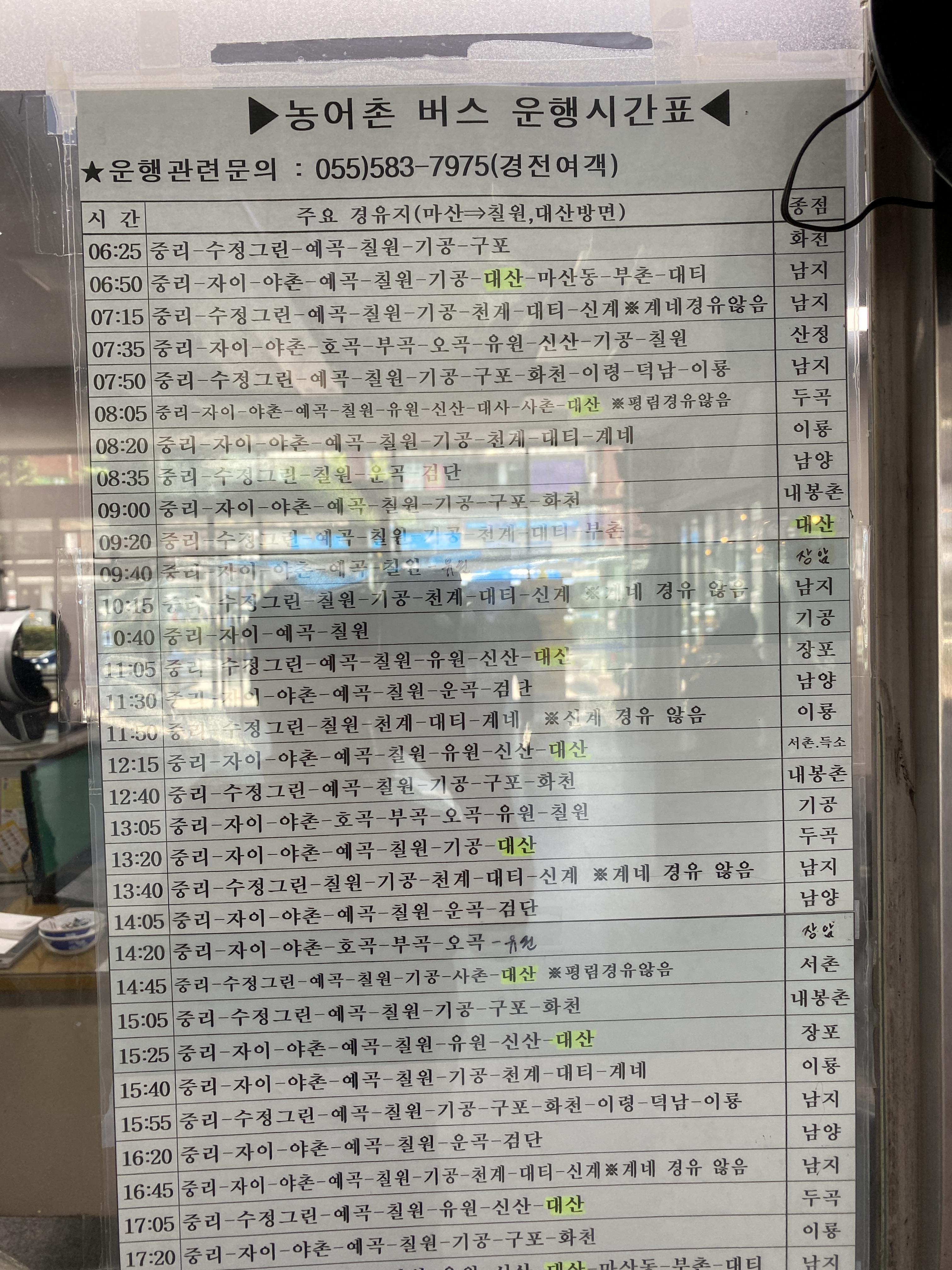 첫차는 07:00, 막차는 20:10에 있고, 2시간에 1대 정도 다닌다.
