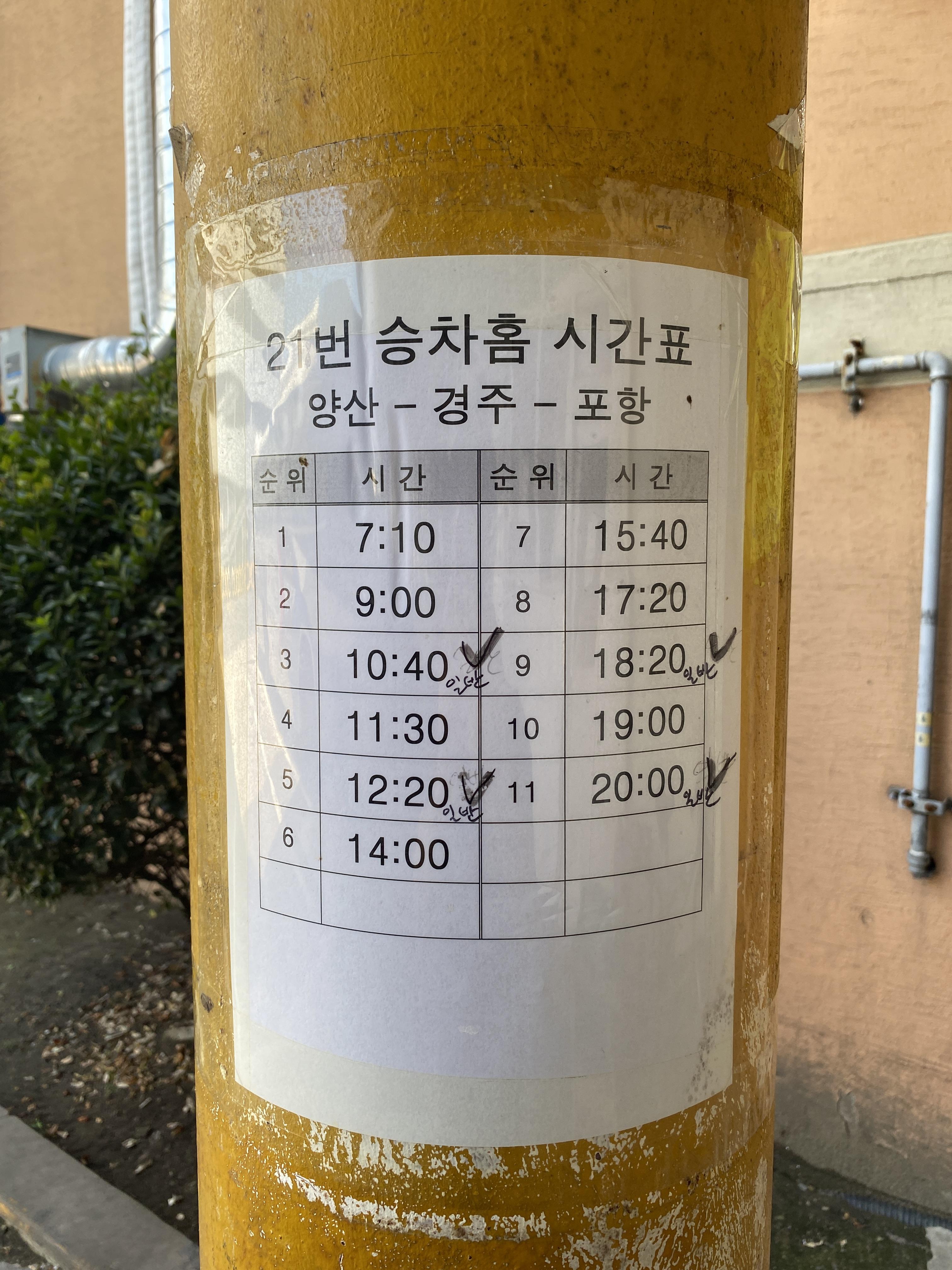 21번 승차홈: 양산-경주-포항방면