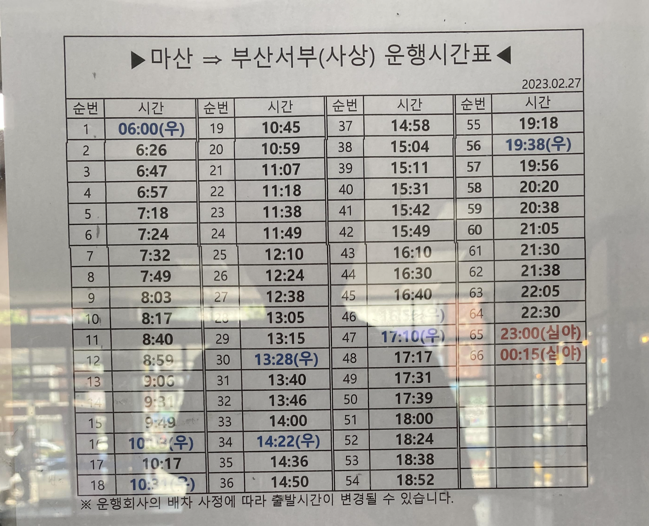밑줄은 일반 버스가 다니는 시간이다.
