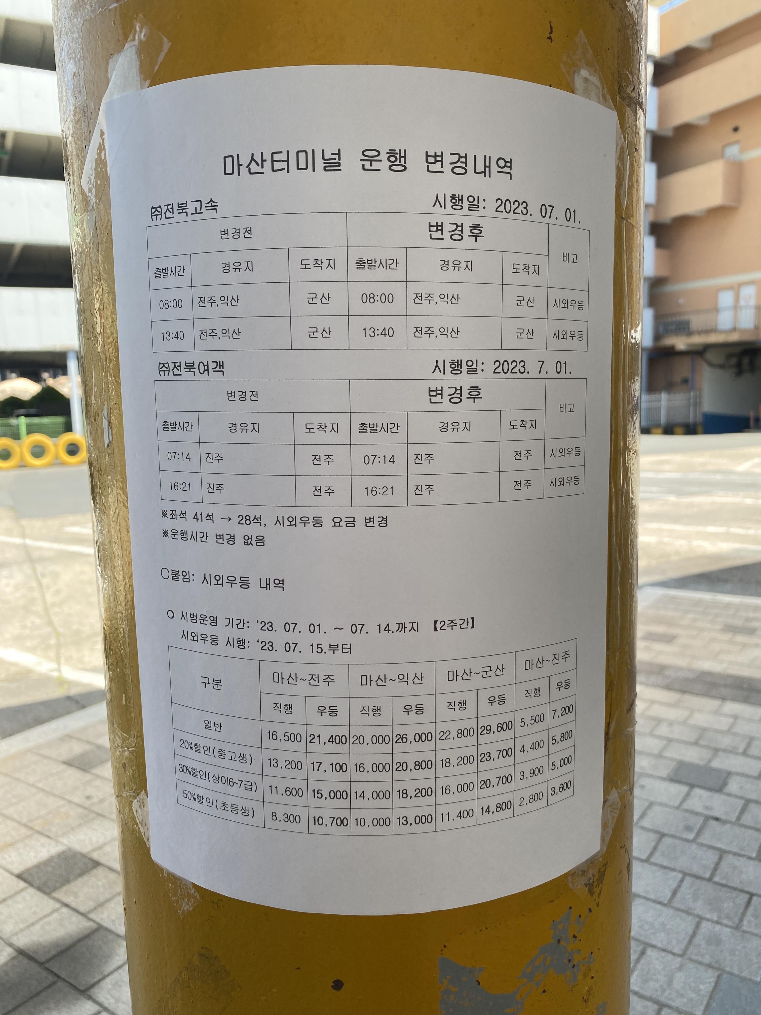 아래의 안내와 시외버스예매 사이트가 안내하는 가격이 다르다.