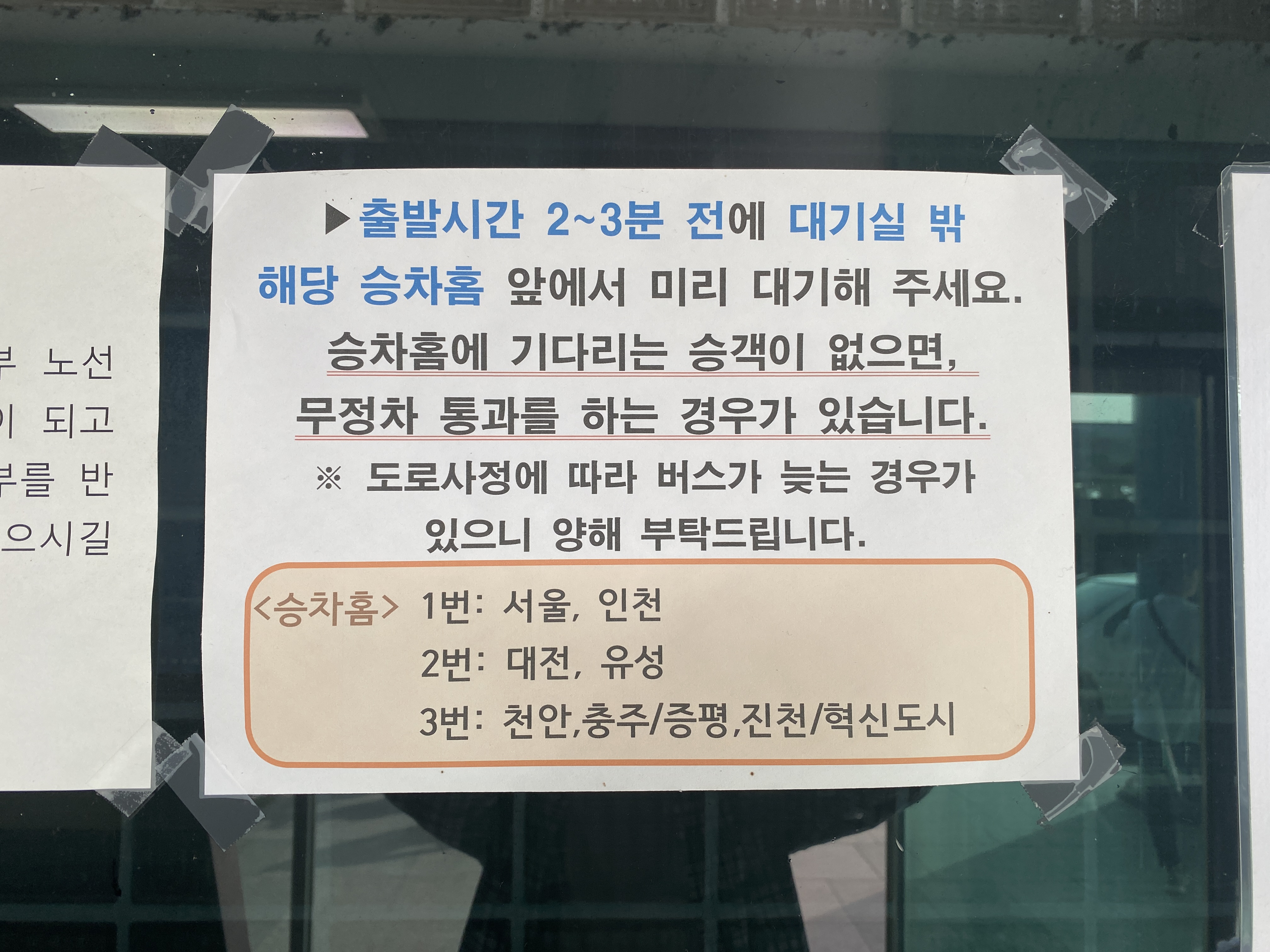 출발시간 2~3분 전에 대기실 밖 승차홈에서 미리 대기해야 한다.