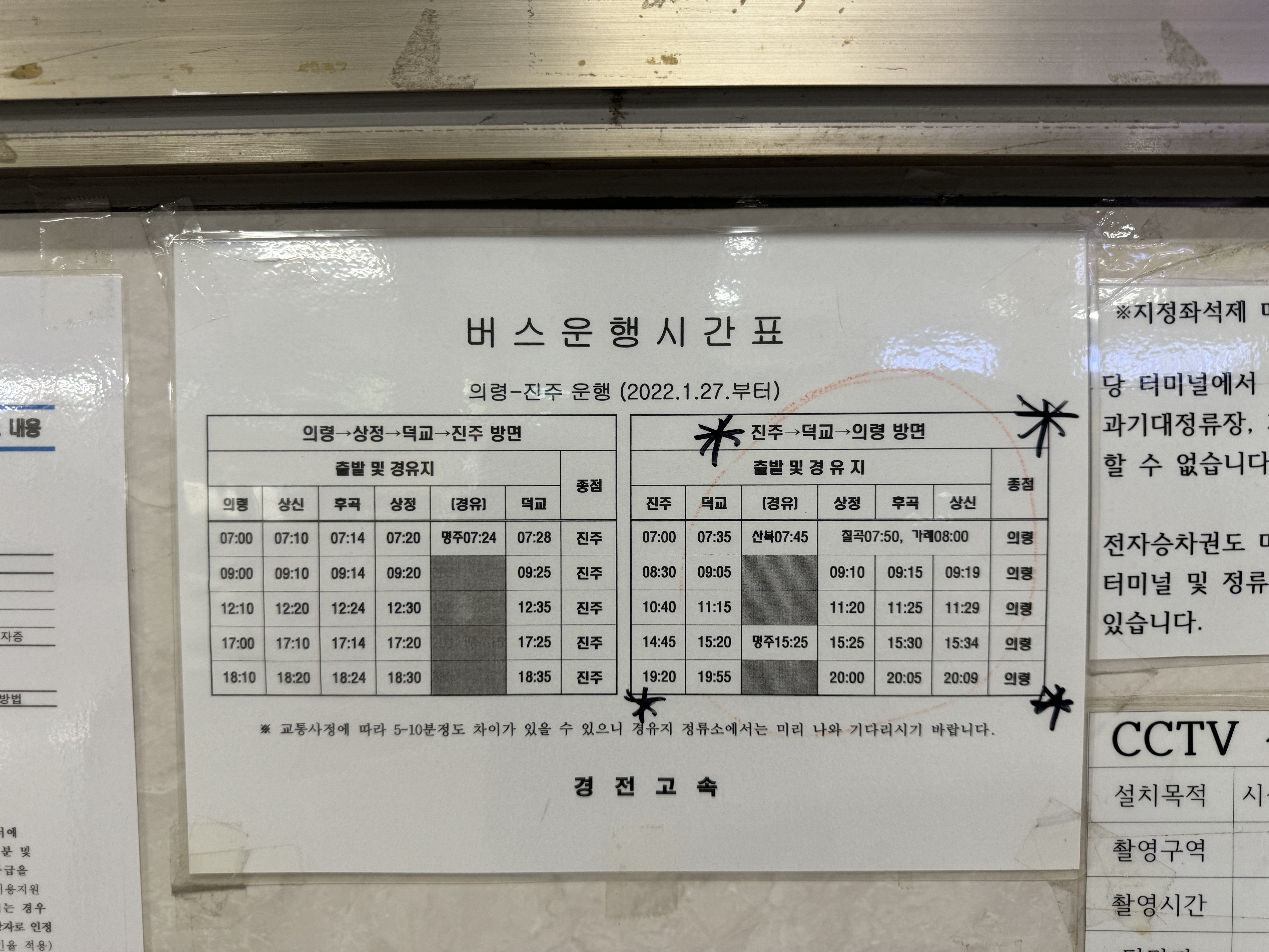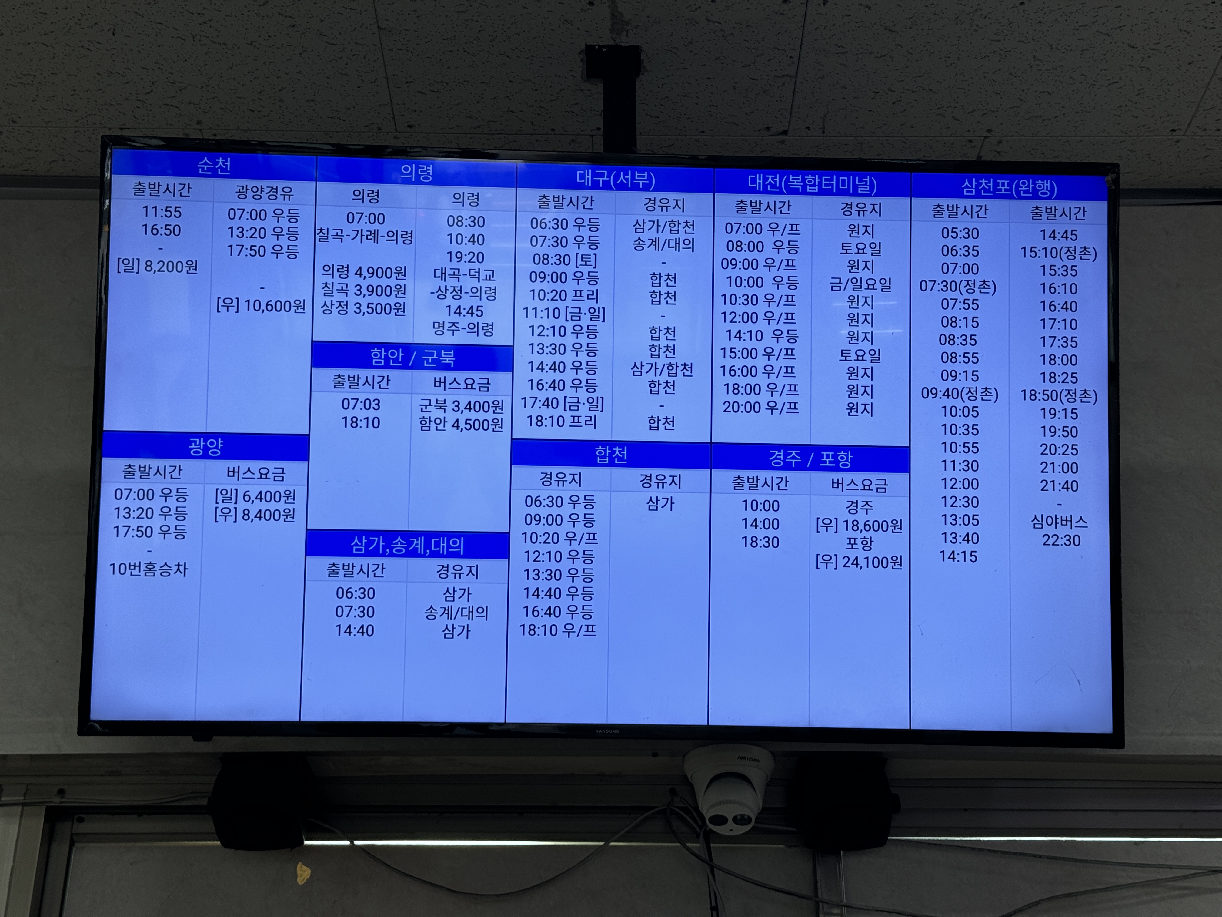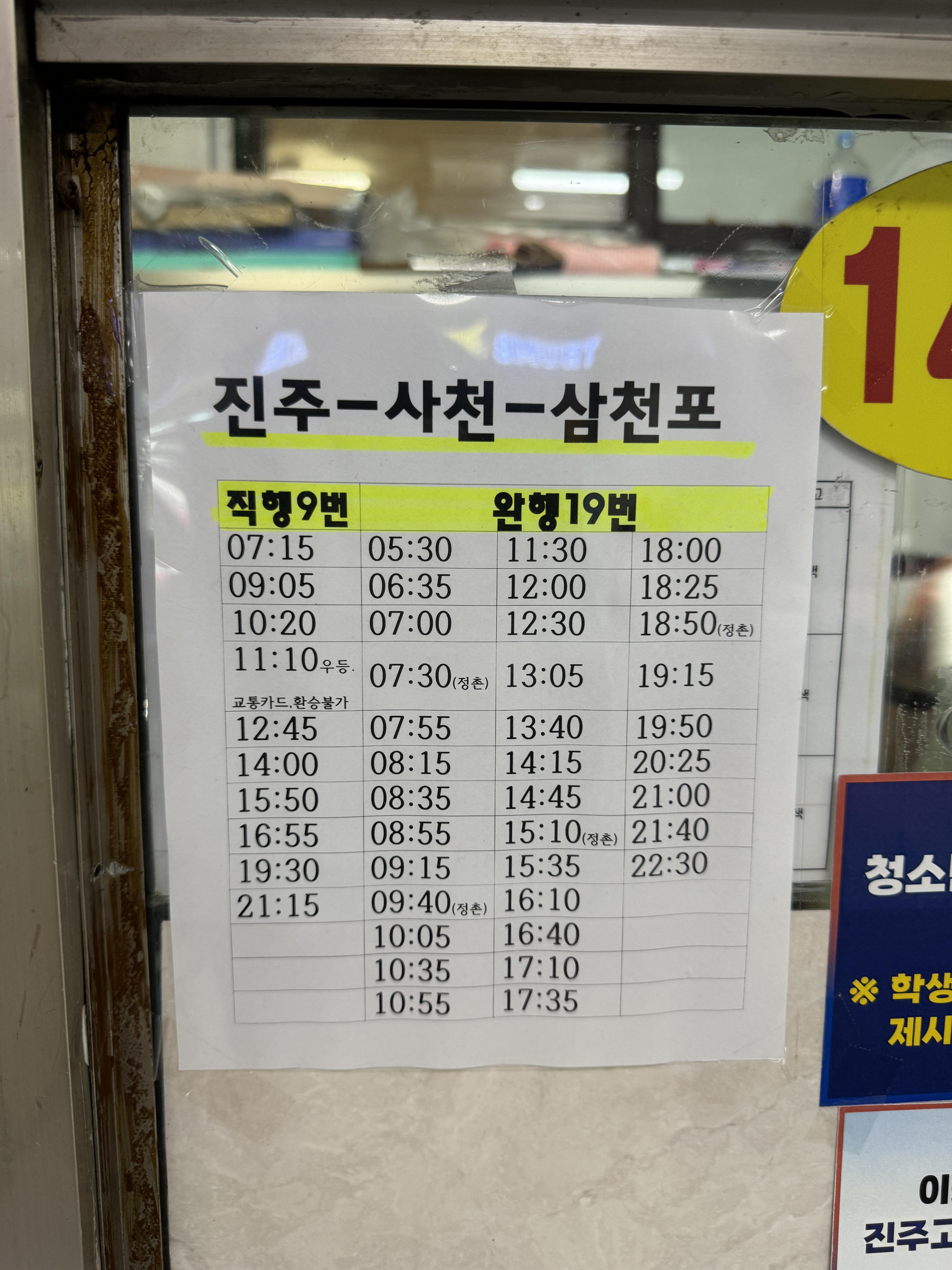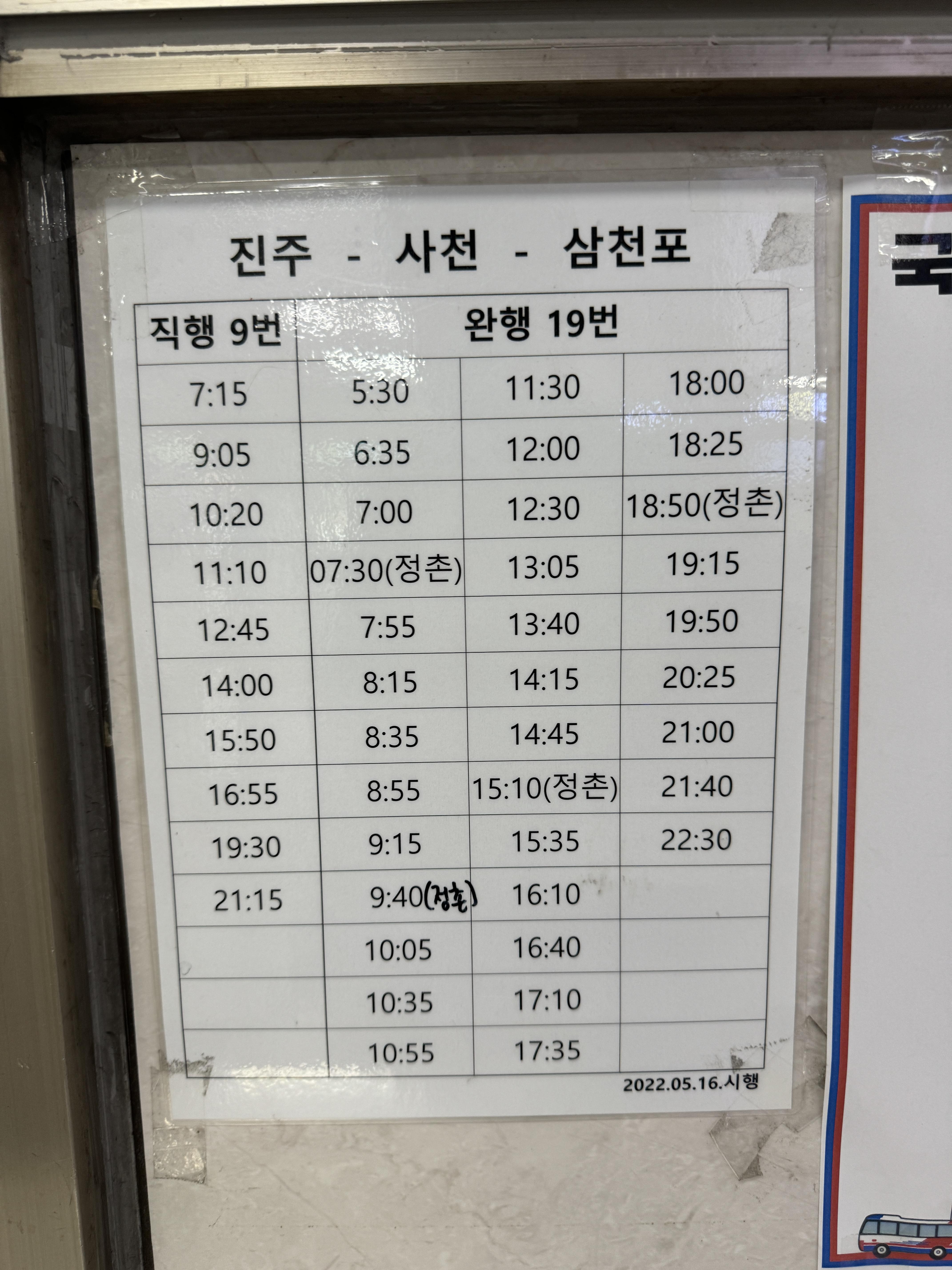 경남의 또다른 중심도시 삼천포, 사천으로 가는 버스 시간표.