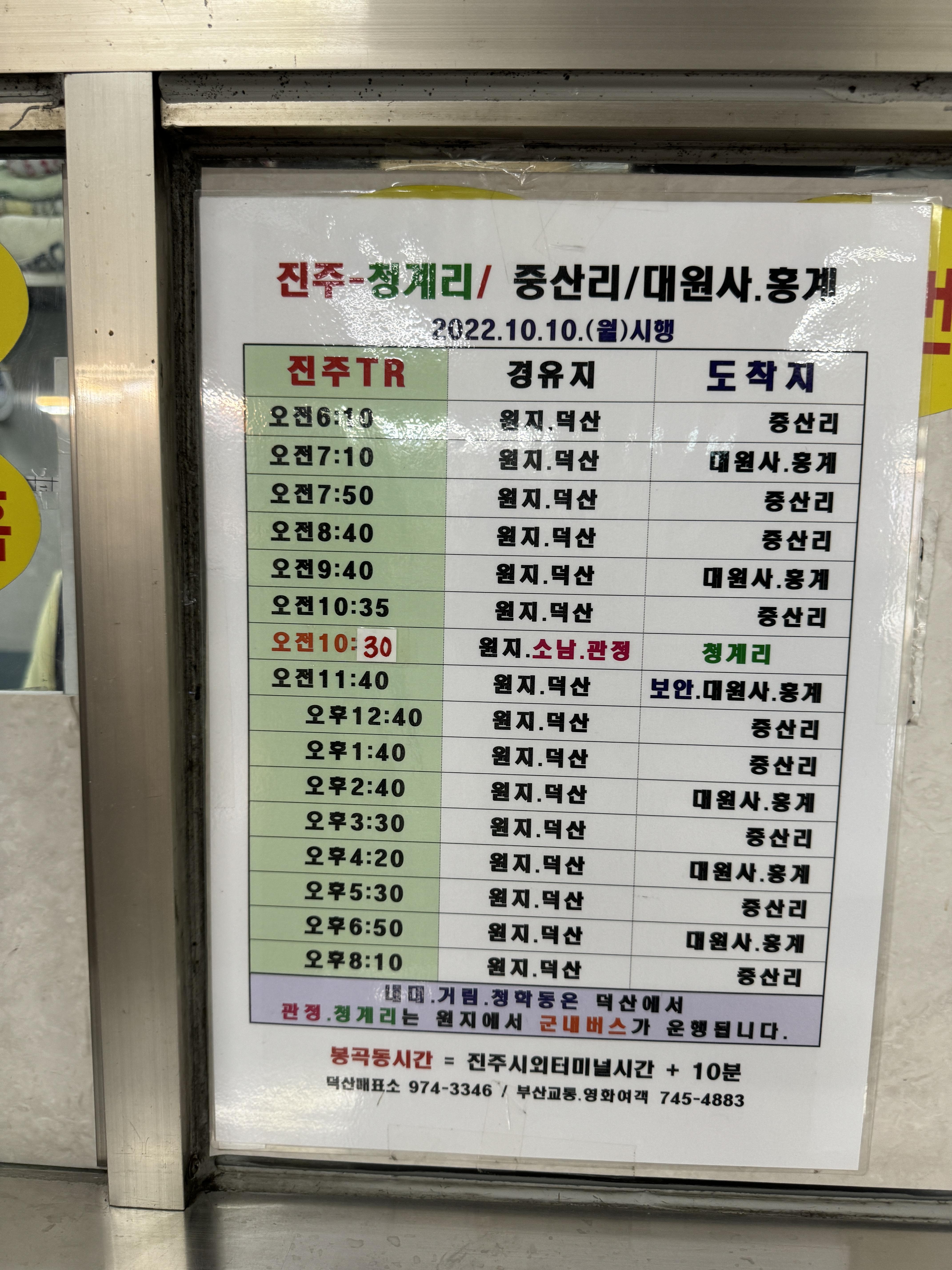 그리고 지리산으로 가는 버스. 진주시외버스터미널에서 청계리, 중산리, 대원사로 사는 버스. 1시간에 1대 정도 다닌다.