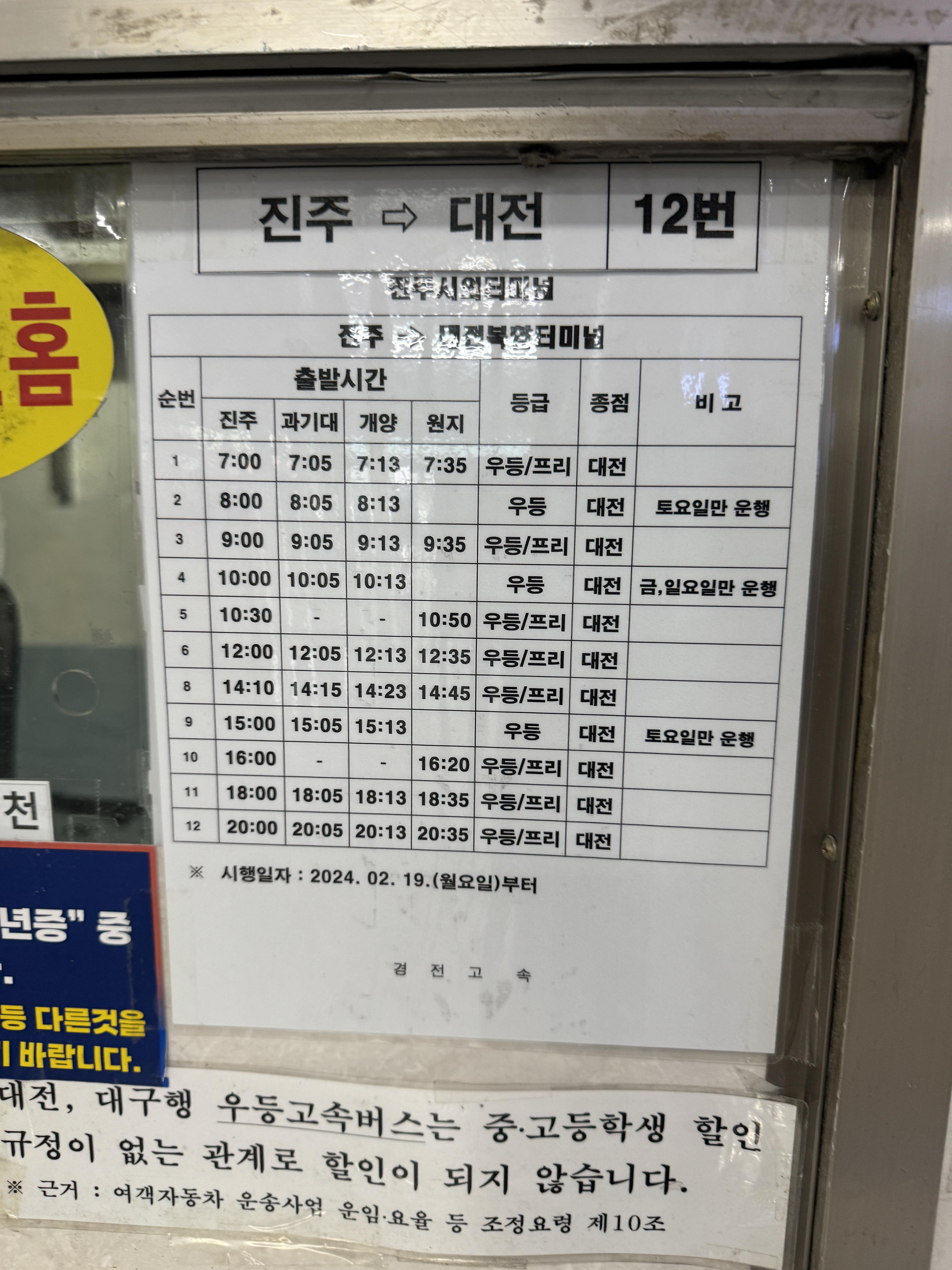 그리고 진주에서 대전과 대구(서부)행 버스 시간표. 대전은 1시간에 1대 매시 정각에 출발한다. 대구 서부행은 마찬가지로 1시간에 1대 다닌다.