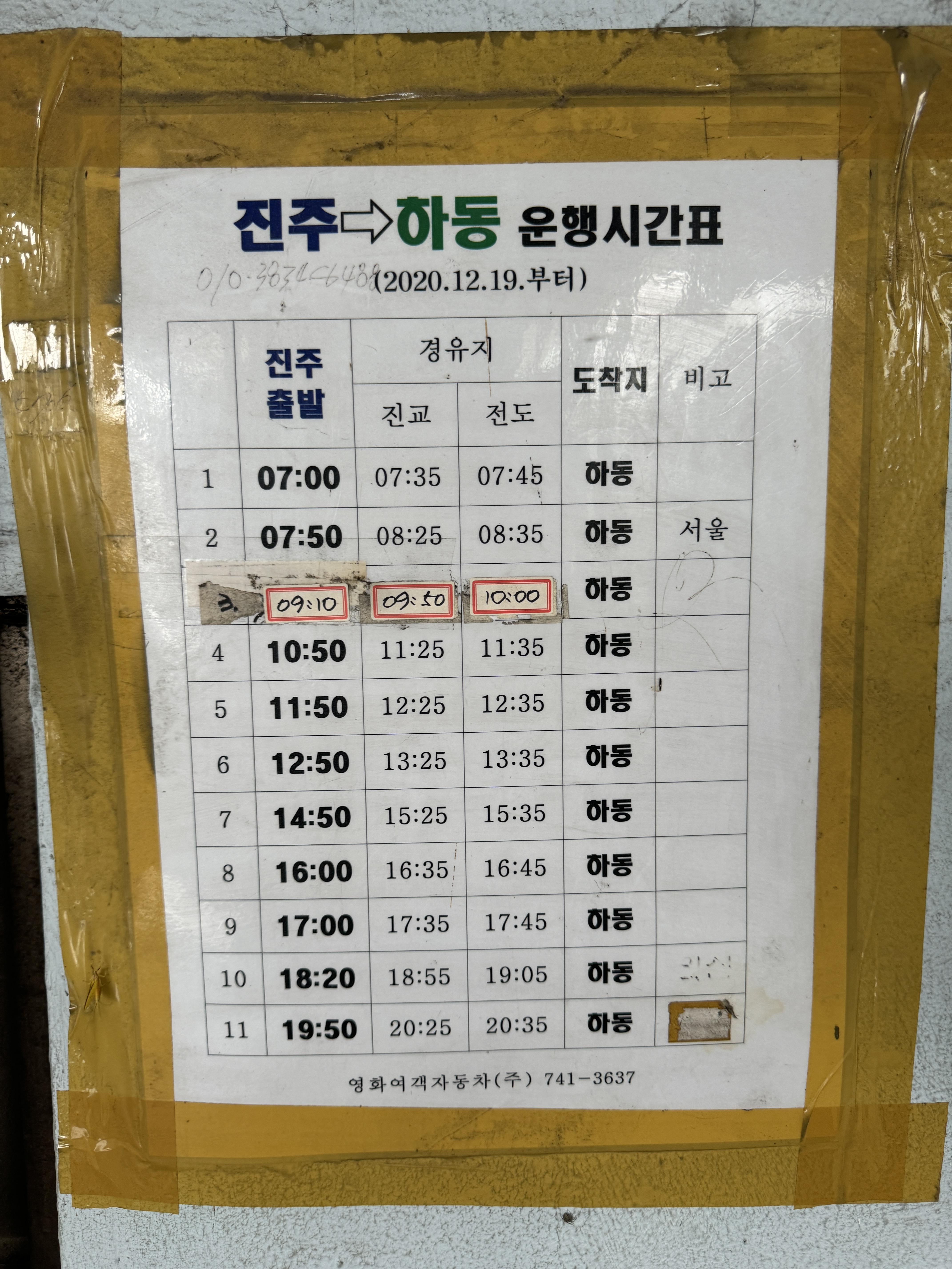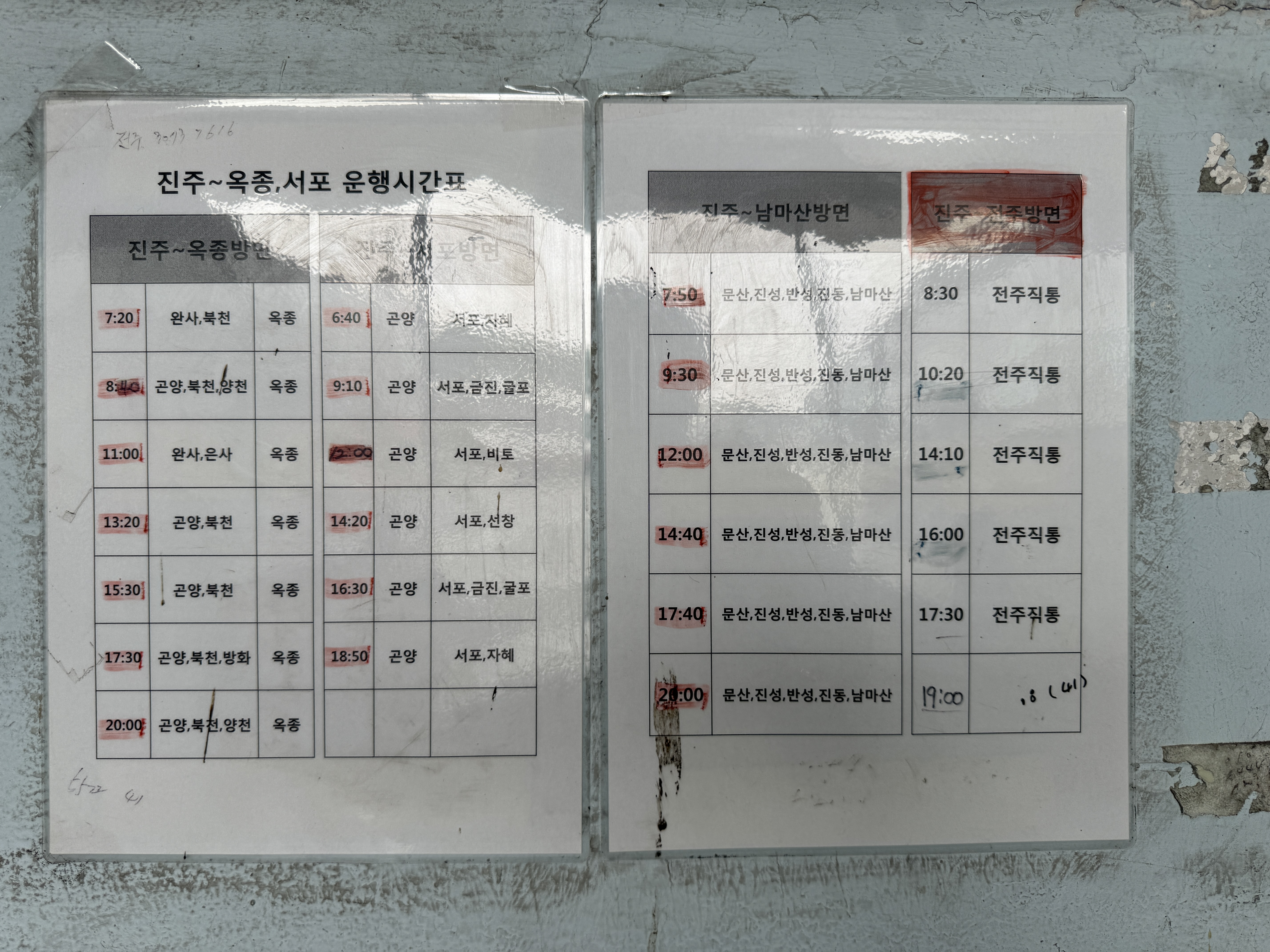 하동 옥종은 하루에 7번, 사천 서포와 남마산, 전주로는 하루에 6번 다닌다. 같은 하동이어도 하동읍내와 하동 옥종으로의 노선도 다르다.
