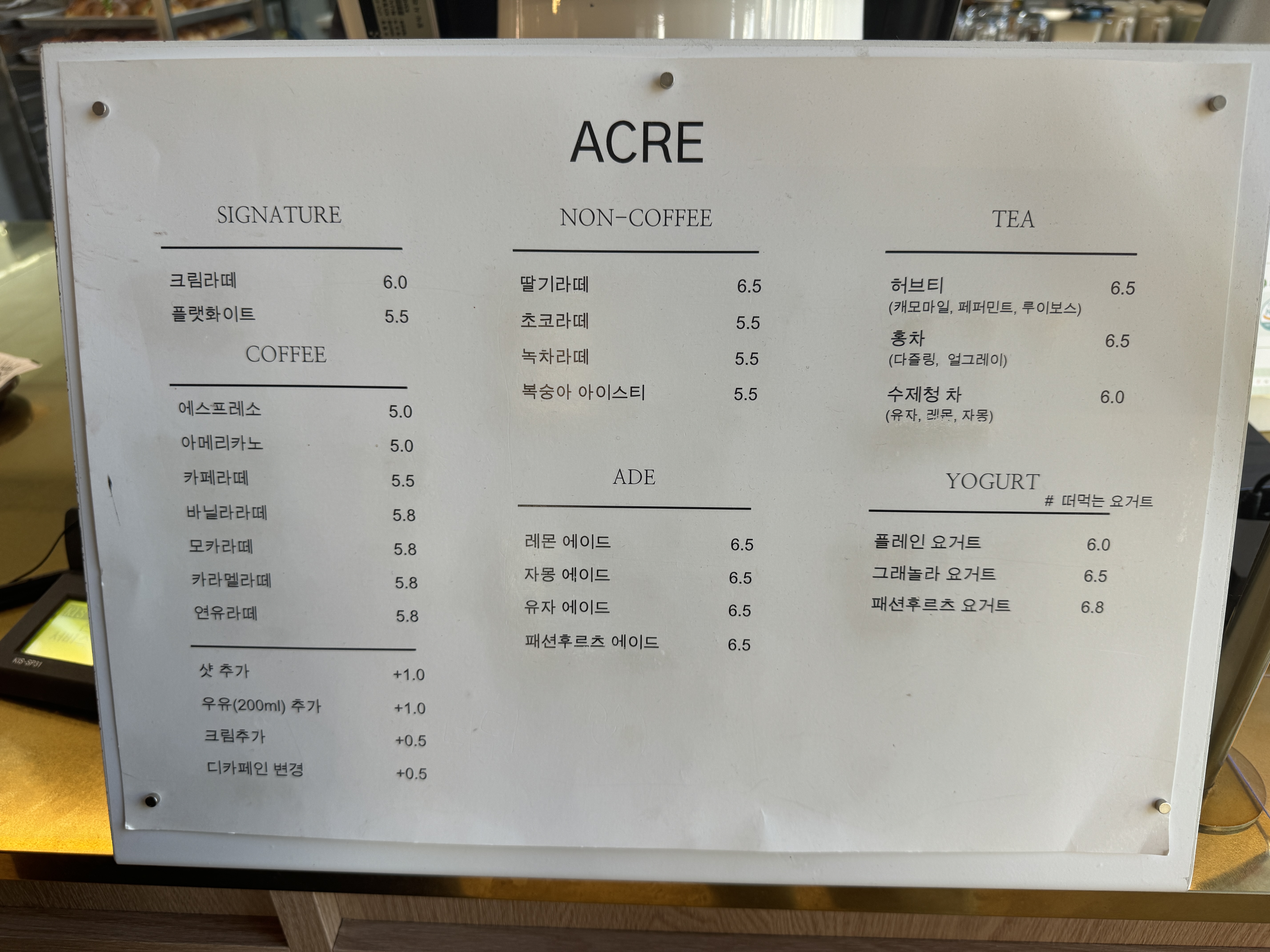 에이커 메뉴. 아메리카노가 5천원이다.라떼는 5500원이다.