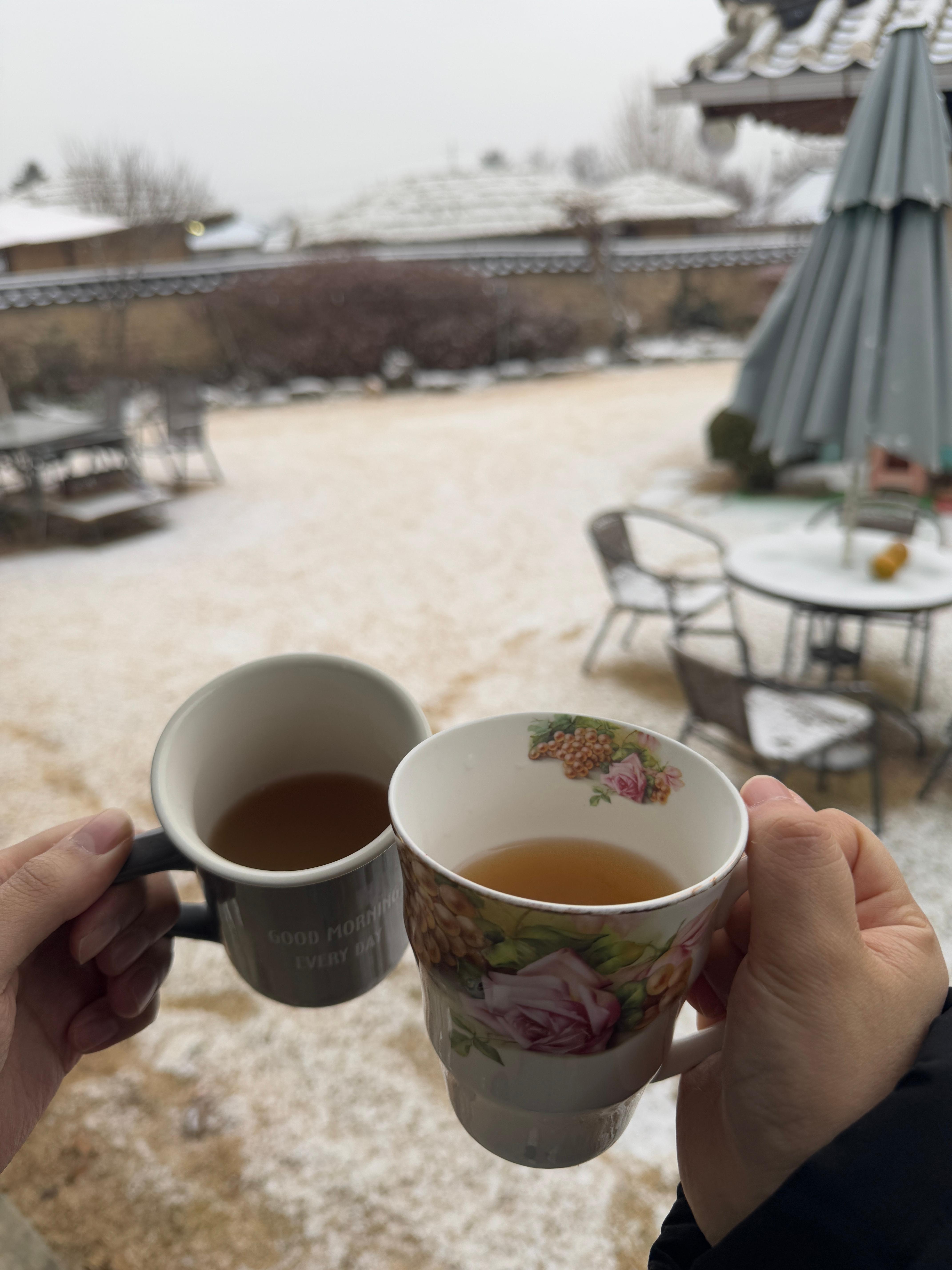 나가려고 하는데, 주인 어르신이 모과차를 주셨다. 그리고 그 순간 마을에선 닭이 꼬끼오~ 하고 울었다.