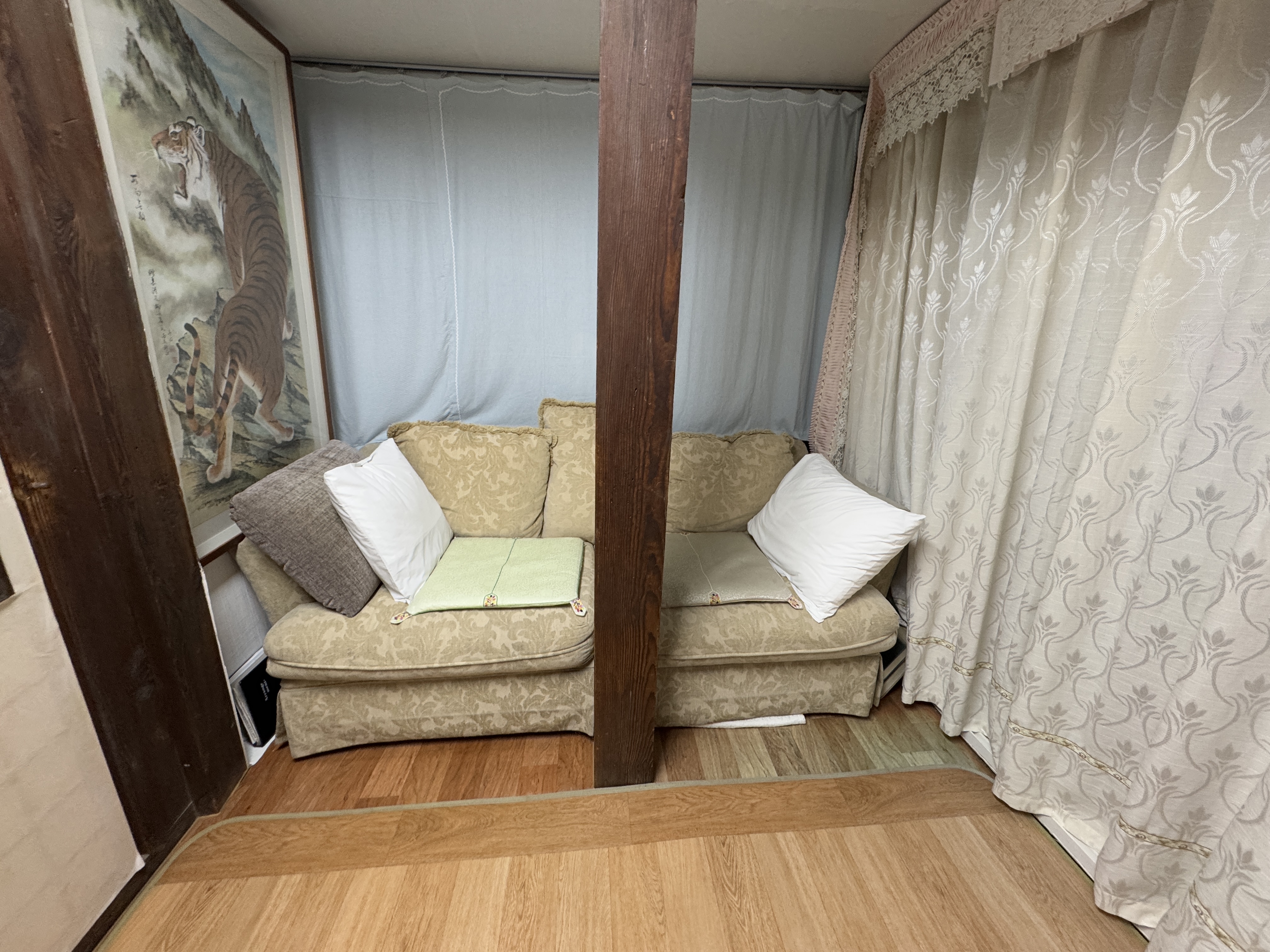 2명이 이용하기에 좁은 편은 아니었다. 아래 사진은 TV를 마주한 소파. 진짜 옛날 할아버지 집에 온 기분. 참고로 TV 받침으로 사용하는 장을 열어보면, 주인 분들의 물건이 있을 정도.